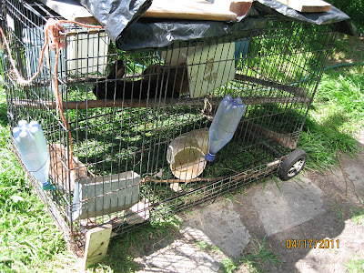 I placed Dusty inside. He was busy sniffing everything for a while before settling down and munching on some weeds. I put a piece of plastic tarp on top of the cage and one of bottom trays on top of it to keep it from blown away. This way Dusty could stay in the shade while he was outside. I shall make a hammock for him like the one they have for Green Faerie Farm's rabbits. I don't expect Dusty to be as efficient as Green Faerie's rabbits since they work as a team of 4 or 5.